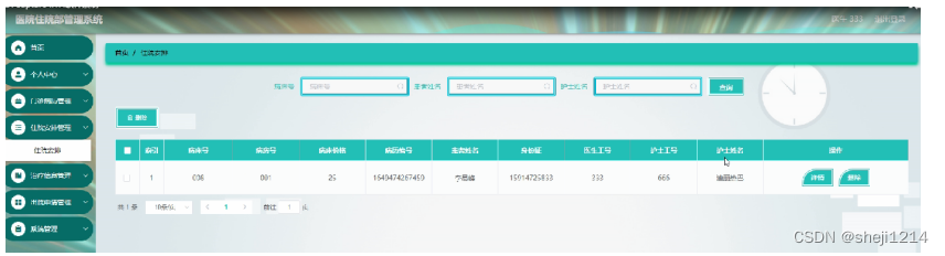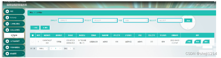 住院安排管理,在住院安排管理页面可以对索引,病床号,病房号,病床价格,病历编号,患者姓名,身份证,医生工号,护士工号,护士姓名等内容进行详情和删除等操作,如图5-11所示。