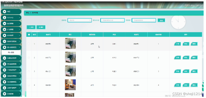 病床信息管理,在病床信息管理页面可以对索引,病床号,图片,使用状态,科室,病房号,病床价格等内容进行详情,修改和删除等操作,如图5-6所示。