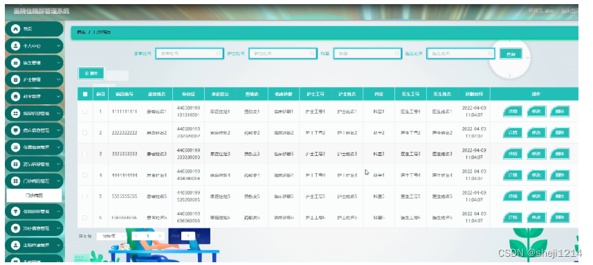 门诊病历管理,在门诊病历管理页面可以对索引,病历编号,患者姓名,身份证,家庭住址,药敏史,临床诊断,护士工号,护士姓名,科室,医生工号,医生姓名,诊断时间等内容进行详情,修改和删除等操作,如图5-9所示。