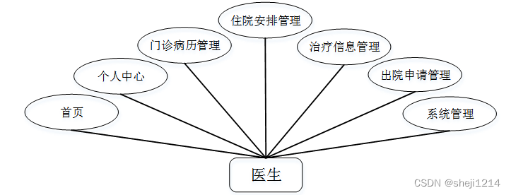 医生登陆后,主要模块包括首页,个人中心,门诊病历管理,住院安排管理,治疗信息管理,出院申请管理,系统管理等功能。医生用例图如图3-3所示。
