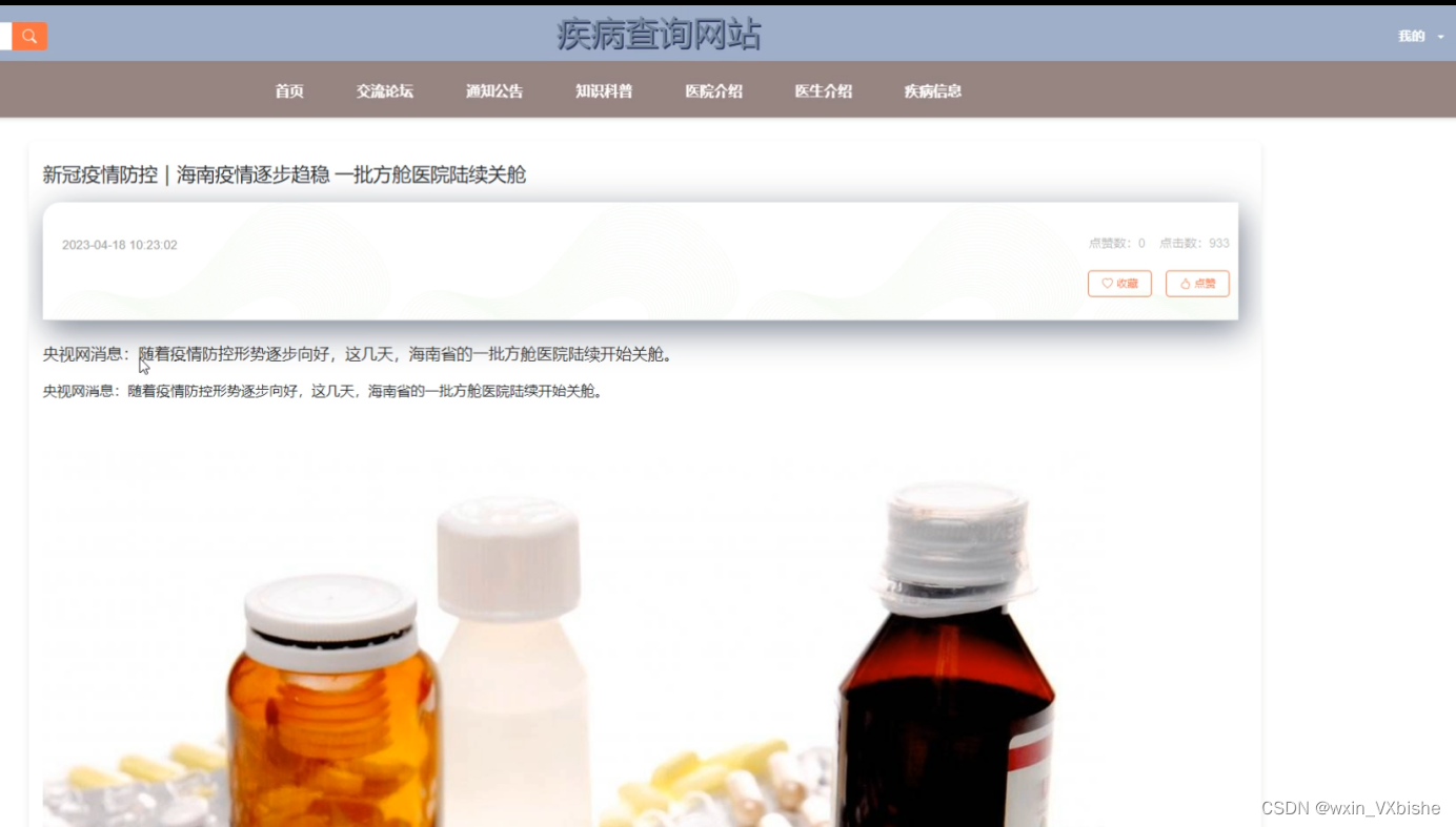 This disease query website is based on the actual needs of the current hospital disease query, starting from the actual work, analyzes the problems existing in the past hospital disease query, combines the structure, concept, model, principle and method of the computer system, and uses the most popular springboot framework, B/S structure, java technology, MySQL database design design and implementation under the condition of various advantages of the computer. This disease query website mainly includes multiple modules such as the implementation of login module, webpage module, administrator module, ordinary user module, and doctor user module. It has helped hospital disease inquiry achieve informatization and networking. Through testing, the system design goals have been achieved. Compared to traditional management models, this system makes reasonable use of network data resources, effectively reducing the economic investment of disease inquiry websites, and greatly improving the efficiency of disease inquiry websites.