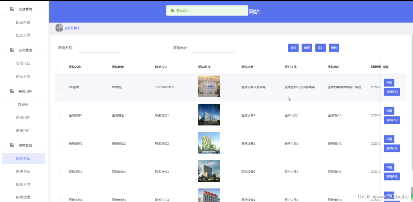 医院介绍,在医院介绍页面中可以添加、删除、修改医院名称、医院地址、联系方式、医院图片、医院设备、医护人员、医院简介等信息,还可以根据需要进行详情、查看评论等操作,如图5-10所示。