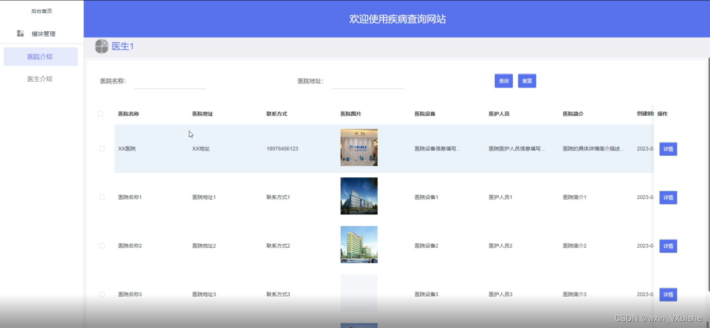 医院介绍,在医院介绍页面医生用户可以查看医院名称、医院地址、联系方式、医院图片、医院设备、医护人员、医院简介等信息,并可进行详情等操作,如图5-12所示。