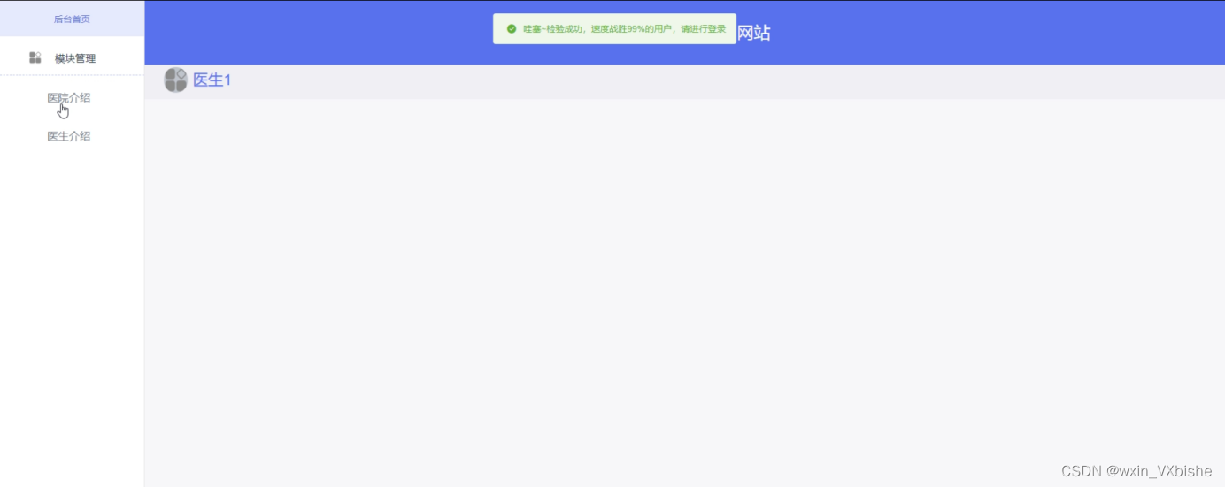 医生用户点击后台进入到系统操作界面,可以查看首页、医院介绍、医生介绍等信息,如图5-11所示。