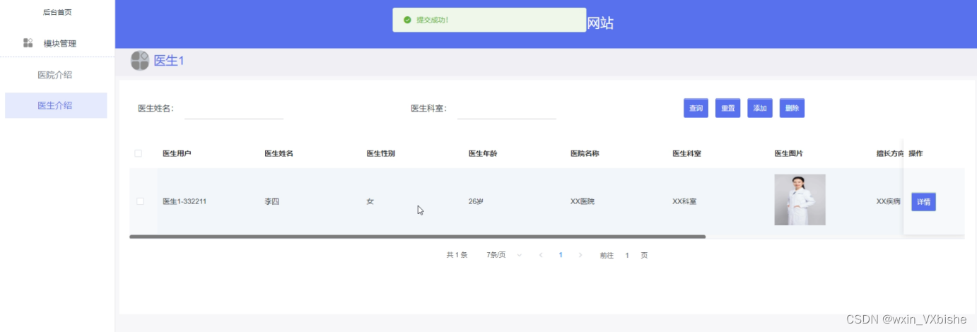 医生介绍:在医生介绍页面可以添加、提交医生用户、医生姓名、医生性别、医生年龄、医院名称、医生科室、医生图片、擅长方向等信息,并可以进行查看、修改、删除等操作,如图5-13所示。