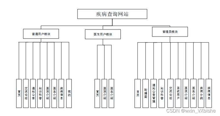 本系统主要包含了登录模块的实现、网页模块、管理员模块、普通用户模块、医生用户模块等多个功能模块。下面分别简单阐述一下这几个功能模块需求。不同的权限对应相应的功能模块的需求,管理员权限的级别是最高的,所以所对应的需求是最多的,根据不同的权限分别简单阐述一下各个权限的需求。
