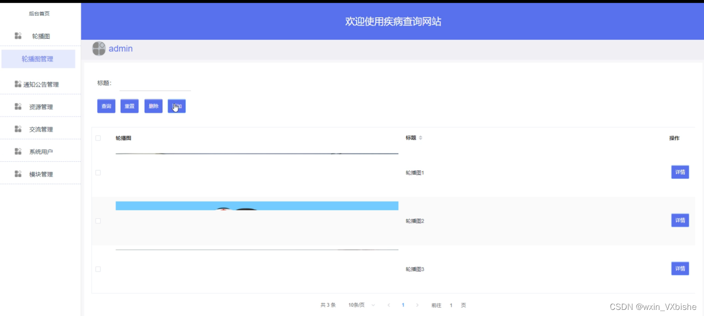 轮播图管理,在轮播图管理页面中管理员可以添加、修改。删除轮播图内容,如图5-8所示。