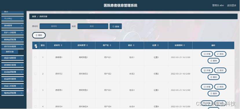病房信息管理,医护人员可在病房信息管理页面查看房间号、房间类型、位置、备注、状态等内容,还可进行删除等操作,如图5-11所示。