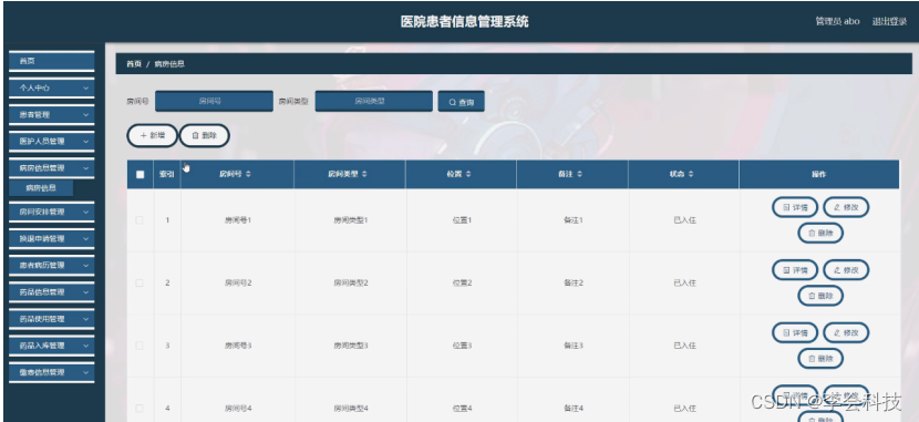 病房信息管理,管理员可在病房信息管理页面查看房间号、房间类型、位置、备注、状态等内容,还可进行新增、修改或删除等操作,如图5-4所示。