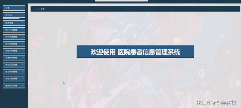 管理员通过登录进入系统可查看个人中心、患者管理、医护人员管理、病房信息管理、房间安排管理、换退申请管理、患者病历管理、药品信息管理、药品使用管理、药品入库管理、缴费信息管理等内容,如图5-2所示。