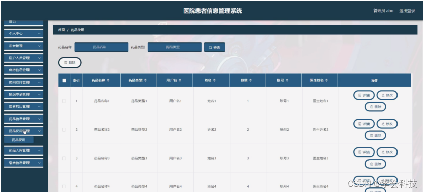药品使用管理,管理员可在药品使用管理页面查看药品名称、药品类型、用户名、姓名、数量、账号、医生姓名等内容,还可进行修改或删除等操作,如图5-9所示。