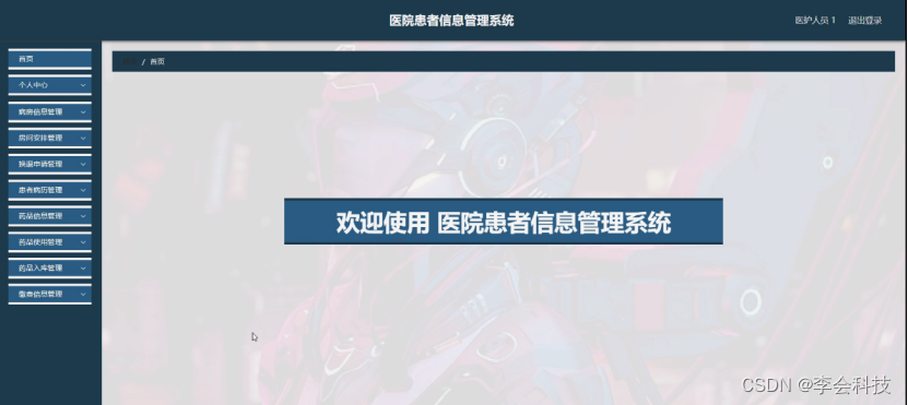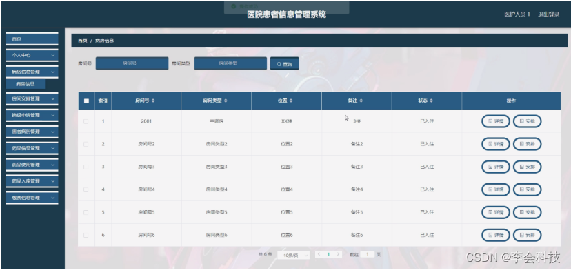 医护人员通过登录进入系统可查看个人中心、病房信息管理、房间安排管理、换退申请管理、患者病历管理、药品信息管理、药品使用管理、药品入库管理、缴费信息管理等内容,如图5-10所示。