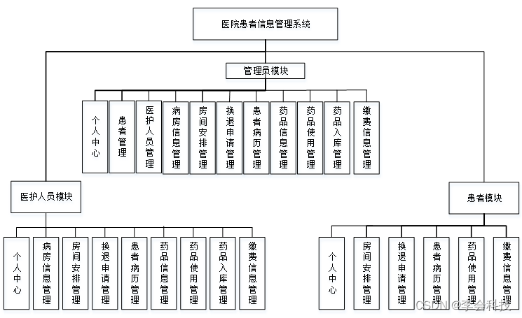 考虑到实际生活中在医院患者信息管理方面的需要以及对该系统认真的分析,将系统权限按管理员、患者和医护人员这三类涉及用户划分。