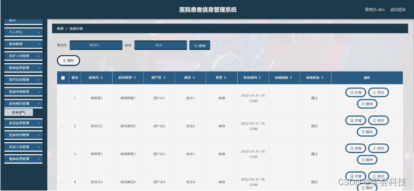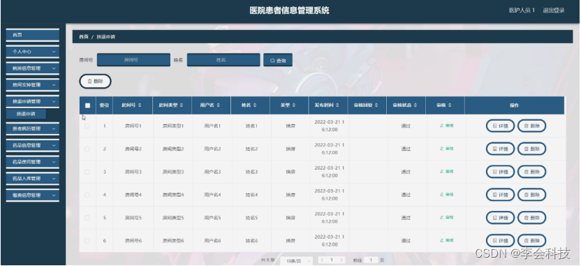 换退申请管理,医护人员可在换退申请管理页面查看房间号、房间类型、用户名、姓名、类型、发布时间、审核回复、审核状态等内容,还可进行删除等操作,如图5-12所示。