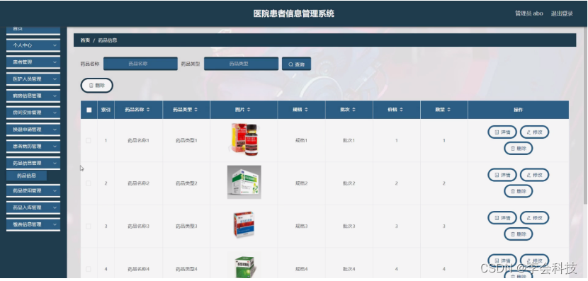 药品信息管理,管理员可在药品信息管理页面查看药品名称、药品类型、图片、规格、批次、价格、数量等内容,还可进行修改或删除等操作,如图5-8所示。
