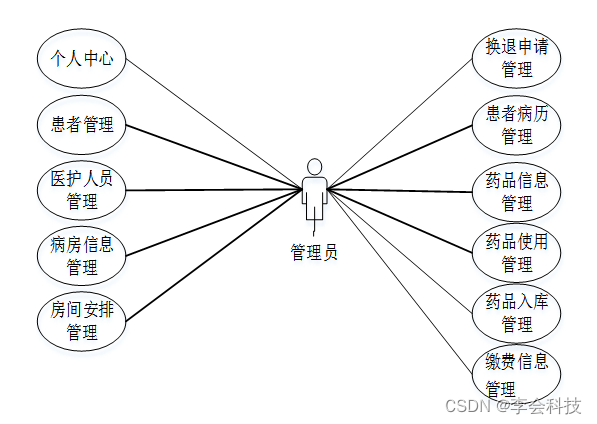 (a) 管理员;管理员使用本系统涉到的功能主要有:个人中心、患者管理、医护人员管理、病房信息管理、房间安排管理、换退申请管理、患者病历管理、药品信息管理、药品使用管理、药品入库管理、缴费信息管理等功能。管理员用例图如图3-1所示。
