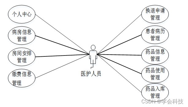 (b)医护人员进入系统可以实现个人中心、病房信息管理、房间安排管理、换退申请管理、患者病历管理、药品信息管理、药品使用管理、药品入库管理、缴费信息管理等功能。医护人员用例图如图3-2所示。