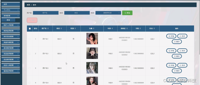 患者管理,管理员可在患者管理页面查看用户名、姓名、性别、头像、年龄、身份证、手机、住址等内容,还可进行修改或删除等操作,如图5-3所示。