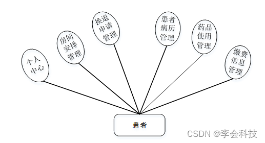 (c)患者进入系统后台可以实现个人中心、房间安排管理、换退申请管理、患者病历管理、药品使用管理、缴费信息管理等功能。患者用例图如图3-3所示。