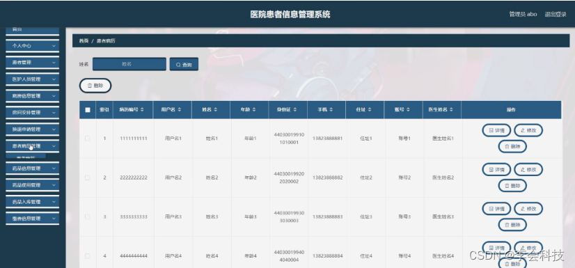 患者病历管理,管理员可在患者病历管理页面查看病历编号、用户名、姓名、年龄、身份证、手机、住址、账号、医生姓名等内容,还可进行修改或删除等操作,如图5-7所示。