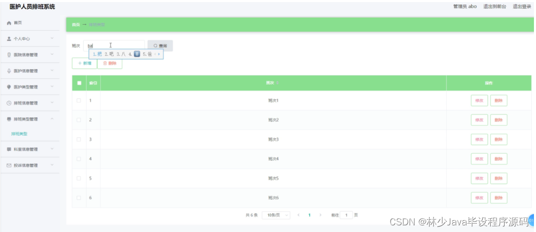 排班类型管理,在排班类型管理页面可以对索引、班次等内容进行修改或删除等操作,如图5-13所示。