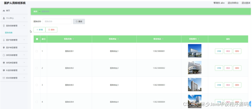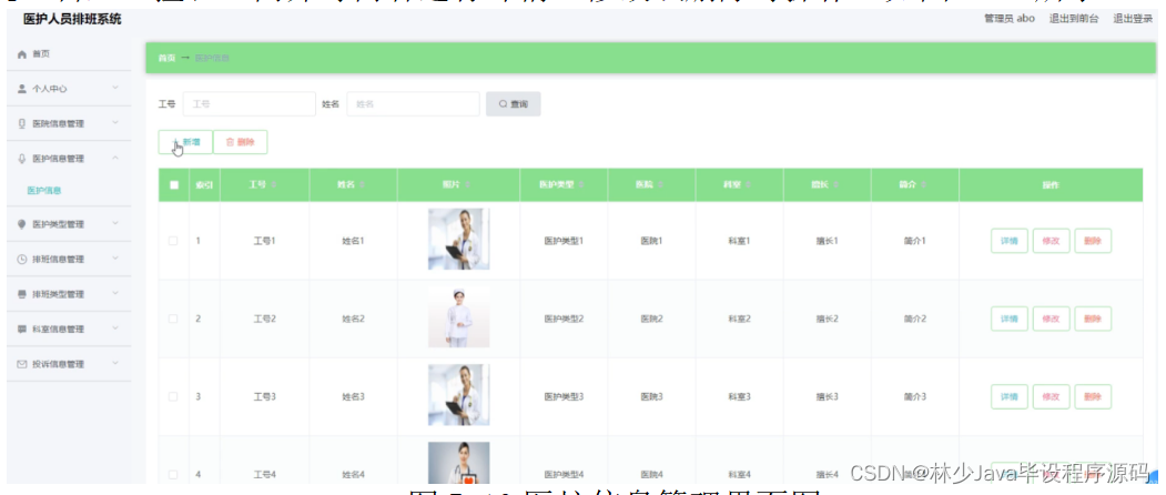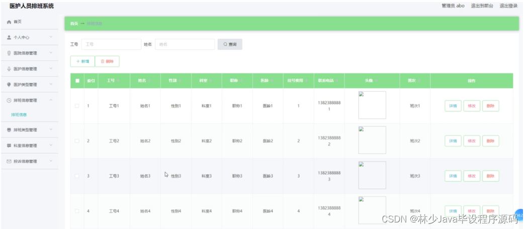 排班信息管理,在排班信息管理页面可以对索引、工号、姓名、性别、科室、职称、医龄、挂号费用、联系电话、头像、班次等内容进行详情、修改或删除等操作,如图5-12所示。