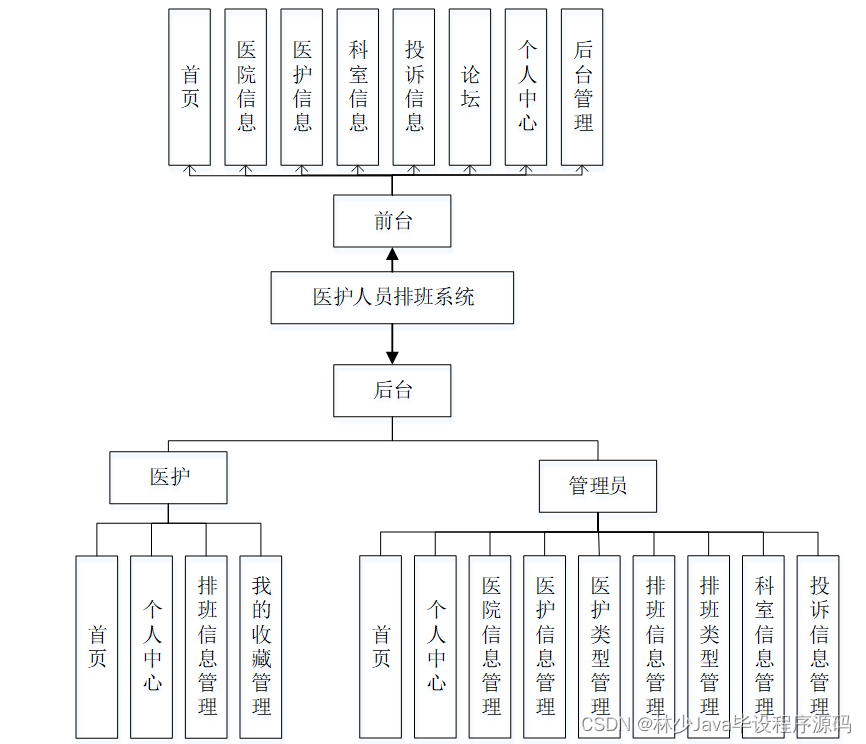 系统架构图属于系统设计阶段,系统架构图只是这个阶段一个产物,系统的总体架构决定了整个系统的模式,是系统的基础。医护人员排班系统的整体结构设计如图4-2所示。