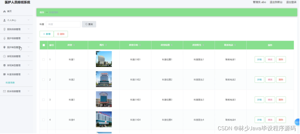 科室信息管理,在科室信息管理页面可以对索引、科室、图片、科室介绍、科室位置、科室医生、联系电话等内容进行详情、修改或删除等操作,如图5-14所示。