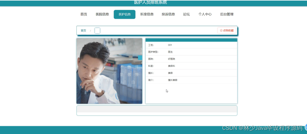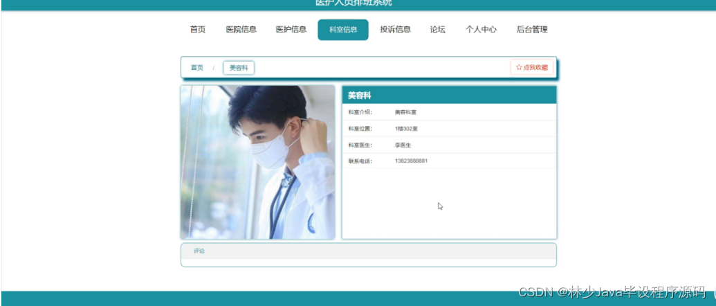 医护信息,在医护信息页面可以查看工号、姓名、照片、医护类型、医院、科室、擅长、简介等详细内容,并进行收藏、评论操作,如图5-3所示。