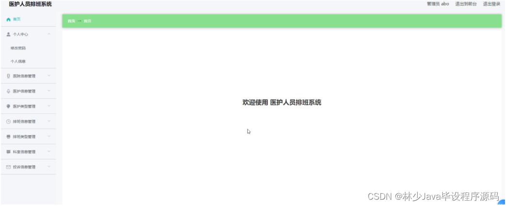 管理员登录系统后,可以对首页、个人中心、医院信息管理、医护信息管理、医护类型管理、排班信息管理、排班类型管理、科室信息管理、投诉信息管理等功能进行相应操作,如图5-8所示。