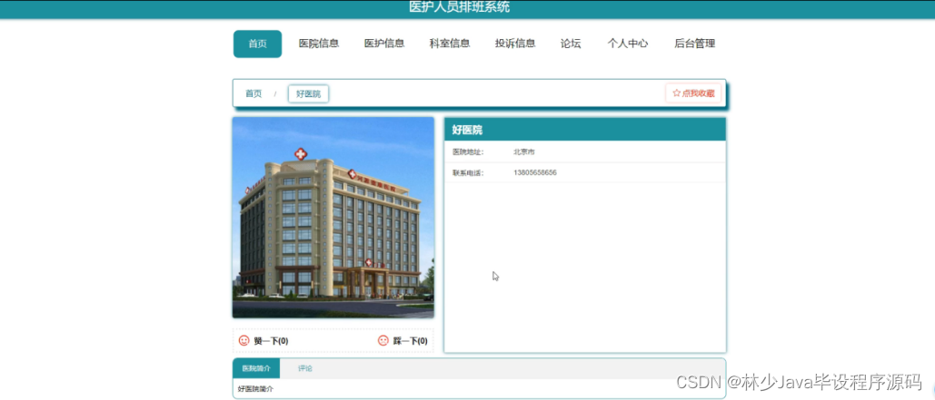医院信息,在医院信息页面可以查看医院名称、医院地址、联系电话、医院照片、医院简介等详细内容,并进行收藏、评论操作,如图5-2所示。