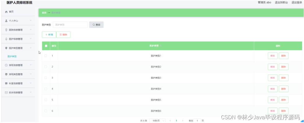 医护类型管理,在医护类型管理页面可以对索引、医护类型等内容进行修改或删除等操作,如图5-11所示。