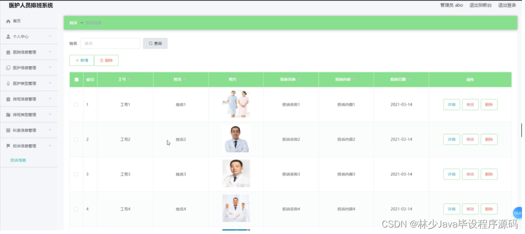 投诉信息管理,在投诉信息管理页面可以对索引、工号、姓名、照片、投诉名称、投诉内容、投诉日期等内容进行详情、修改或删除等操作,如图5-15所示。