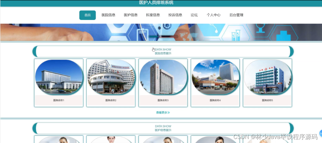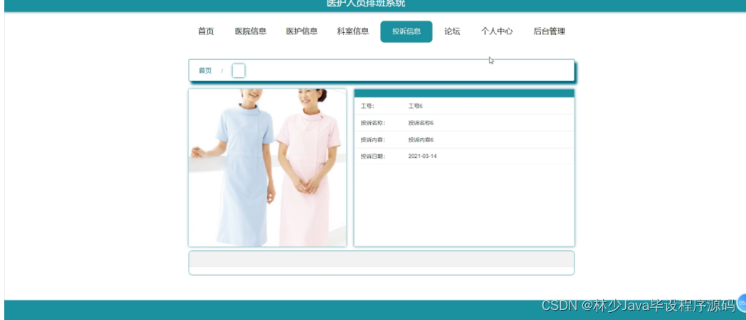 医护人员排班系统,在系统首页可以查看首页、医院信息、医护信息、科室信息、投诉信息、论坛、个人中心、后台管理等内容,如图5-1所示。