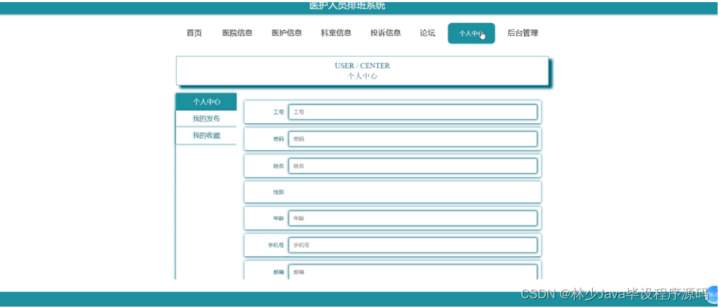 个人中心,在个人中心页面通过填写工号、密码、姓名、性别、年龄、手机号、邮箱等信息进行更新信息,根据需要对我的发布、我的收藏进行相对应操作,如图5-6所示。