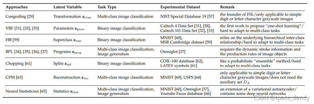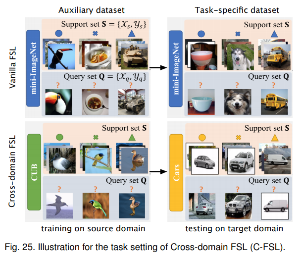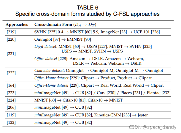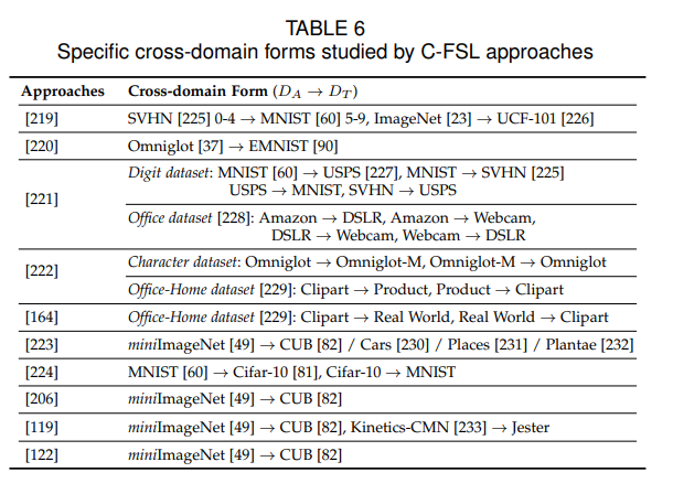 - 跨域FSL(C-FSL),普通FSL任务中,假设辅助数据集和特定于任务T的数据集均来自相同的数据域,当处理的FSL任务来自于一个没有相关辅助样本可用的新域时,需要利用一些跨域样本作为辅助数据。C-FSL与域适应高度相关,其标签控件在辅助数据集和任务特定的数据集之间不想交,