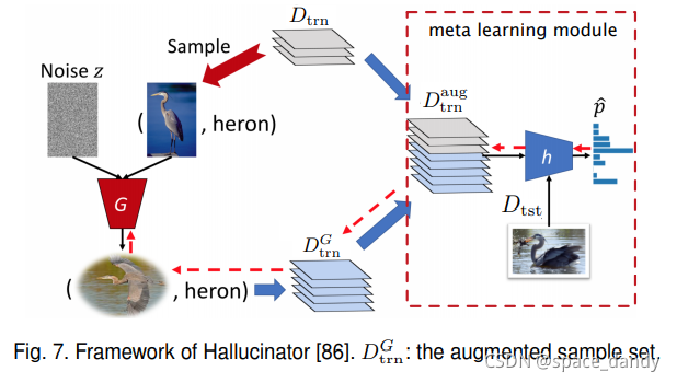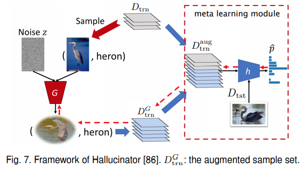 视觉领域,常见的增广是通过旋转、翻转、裁剪和添加噪声等方法,这些低级的增广手段不足以提高FSL模型的繁华能力,再次背景下,提出了更为复杂的增广模型。基于增广的方法框架如下: