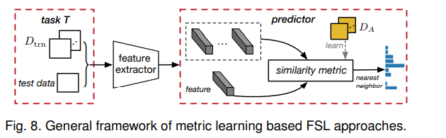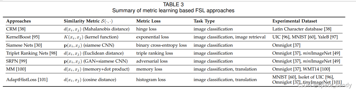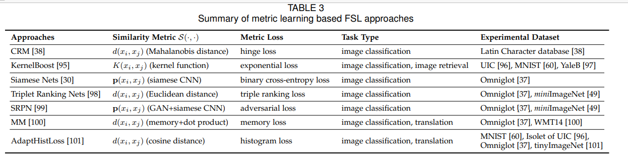 度量学习使用辅助数据集创建相似性度量,并将其推广到新的任务T类,相似性度量可以是一个简单的距离度量、一个经过验证的网络或其他可行的模块或算法。几种具有代表性的基于度量的FSL方法包括CRM、KernelBoost、Siamese Nets、Triplet Ranking Nets、SRPN、MM和AdaptHistLoss。