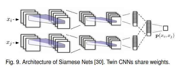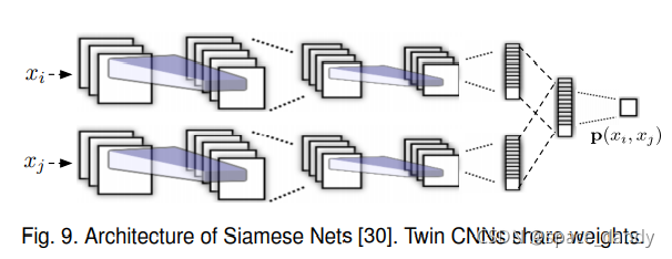 - SiameseNets是第一个深度神经网络引入FSL任务的工作,由共享相同权重的两个CNN组成,这两个CNN接受一对样本作为输入,在顶层的输出被合并,以输出单个成对的相似性,其损失函数选用BCEloss