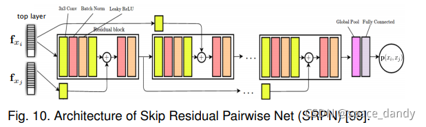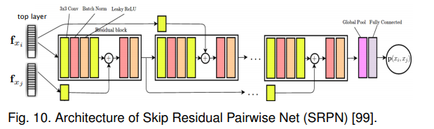 - SRPN为Siamese Nets的变种,设计两方面的修改:一是将SiameseNets顶层的简单成对组合替换为更为复杂的Skip residual networks;二是使用额外的GAN通过将Skip Siamese Nets作为鉴别器网络并引入另一个基于自动编码的生成器来正则化Skip residual networks。