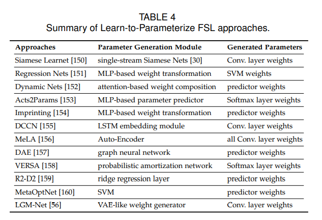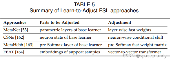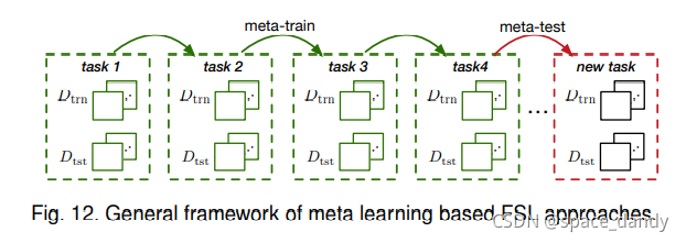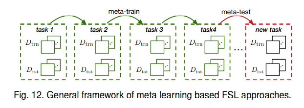 元学习分为两个阶段处理FSL问题:元训练和元测试。元训练中,模型暴露于许多独立的监督任务,这些任务在辅助数据集上构建,以了解如何适应未来的相关任务,所有的任务都来自于同一个任务分布并遵循相同的任务范式;元测试阶段,模型在一个新任务上进行测试,该任务的标签控件与元训练中看的标签不相交。基于元学习的FSL方法分为5个子类,L2M,L2F,L2P,L2A和L2R。