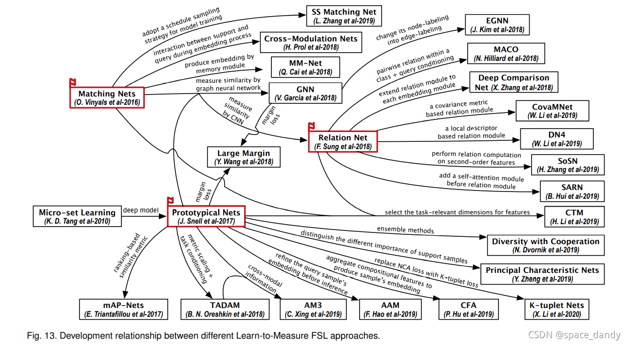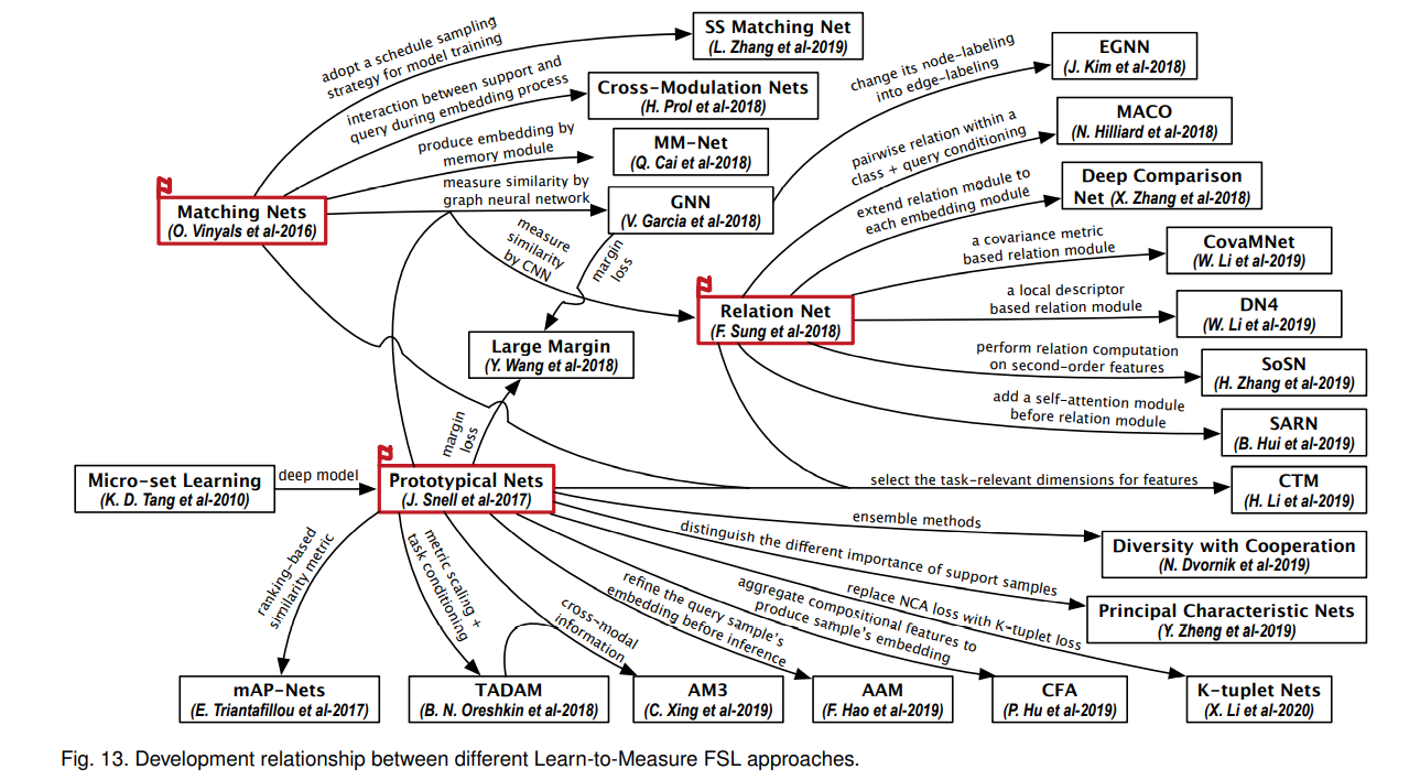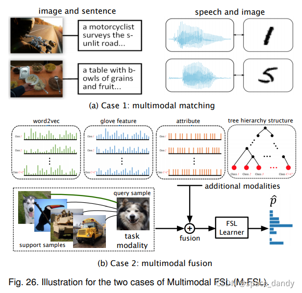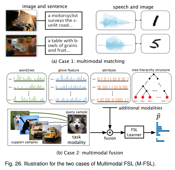 - 多模态FSL,M-FSL设计来自附加模态的信息和数据,根据附加模态的作用,分为多模态匹配和多模态融合。M-FSL的多模态匹配旨在学习从一个模态到另一个模态的映射;多模态融合允许FSL的学习者使用来自其他模态的额外信息来帮助任务模态中的学习