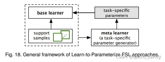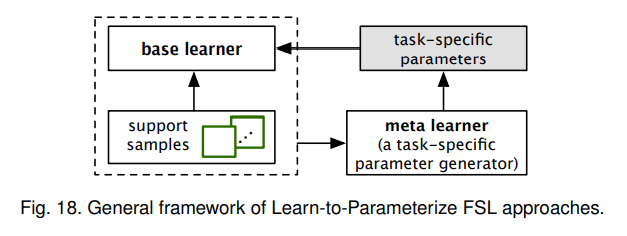 L2P,Learn-to-Parameterize的思想是为新任务参数和基础学习者或者基础学习者的某些子部件,使其更为具体的处理某些任务。大多数的L2P方法也包括基本学习者和元学习者,与L2F的区别在于,L2P方法的两个学习者在每个任务中同步训练,元学习者本质上是任务特定的参数生成器。对于某个任务T,元学习者需要根据任务T的少数支持样本和处理这些样本的当前基础学习者的状态,为基础学习者或其子部分生成一些特定于T的参数。
