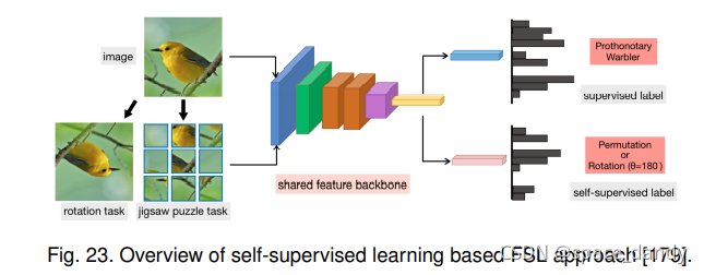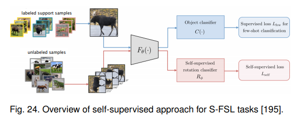 - 半监督FSL,S-FSL假设N-way K-shot任务的训练集不仅包含标记的支持样本,还包含一些不属于任务类的未标记样本,研究人员被允许使用半监督训练集构建他们的FSL系统