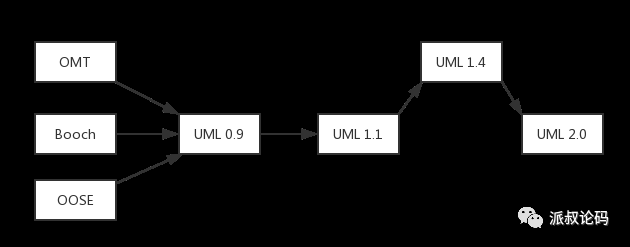 回到1994年,Booch和Rumbaugh开始拉开了统一建模语言UML(Unified Modeling Language)的创立工作。初期,他们将Booch93方法和OMT-2方法统一起来,提出了“统一方法”(Unified Method,UM)0.8版本(草案),并于1995年10月份发布出来。同年秋天,Rational软件并购了Iva Jacobson 所在的Objecotry AB公司,至此Jacobson携OOSE方法正式加入,形成了UML历史上重要的三人组合。在将OOSE与之前的UM0.8整合后,1996年6月和10月分别发布了两个新的版本并将UM重新命名为UML,即UML 0.9和UML 0.91。