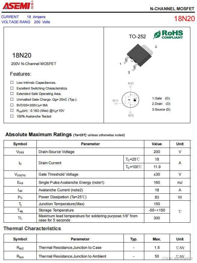18N20的电性参数:最大漏源电流18A;漏源击穿电压200V