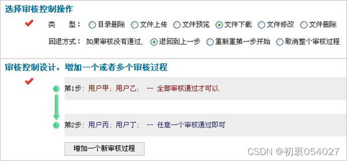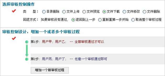 例如,给“测试文件夹”设置了“文件下载”的审核流程,审核的第一步是由“用户甲”和“用户乙”来共同审核,且设置时必须都同意通过才行,第二步是由“用户丙”和“用户丁”共同审核,但是只要任意一个通过即可,审核未通过时的回退方式是“退回上一步”,如图1所示: