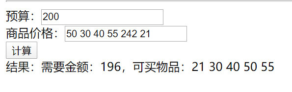 {function js(){let ys=$("#ys").val(),jg=$("#jg").val()let res=0,km=[]//需要金额 可买let arr=jg.split(" ")arr.sort((a,b)=>a-b)for(let i=0;i Number(ys)){res-=Number(arr[i])break}km.push(Number(arr[i]))}console.log(res,km)$("#res").text(`需要金额:${res},可买物品:${km.join(" ")}`)}
