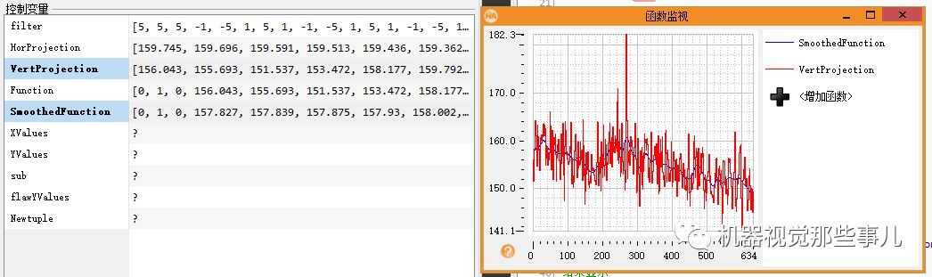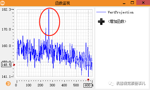 平滑垂直灰度投影函数后,显示垂直投影曲线与平滑曲线,如下图所示,通过将两者曲线差分,超过一定阈值,即为缺陷的灰度投影值。