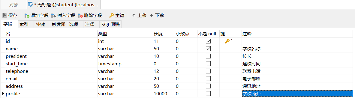 `profile` varchar(10000) CHARACTER SET utf8 COLLATE utf8_general_ci NULL DEFAULT NULL COMMENT '学校简介',